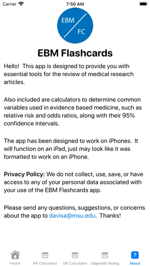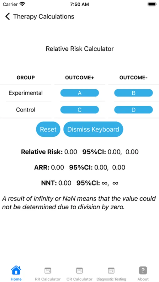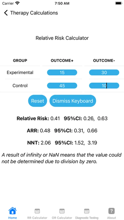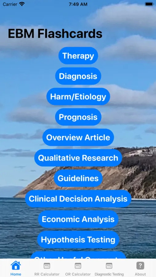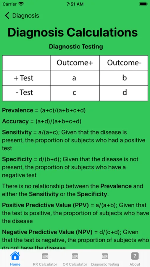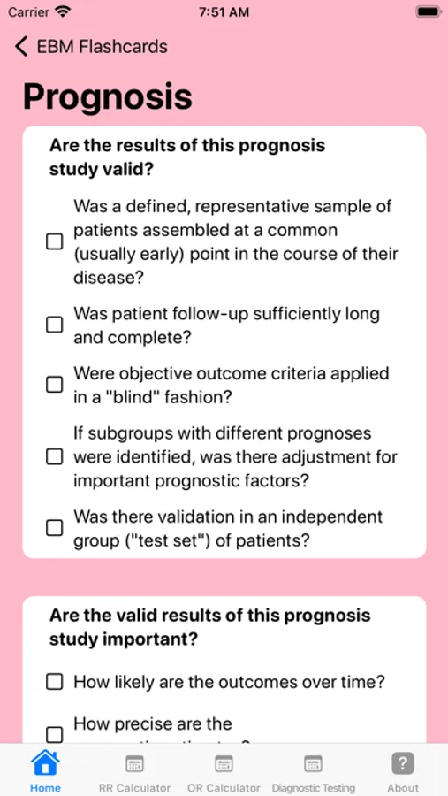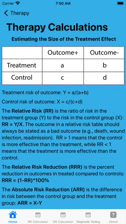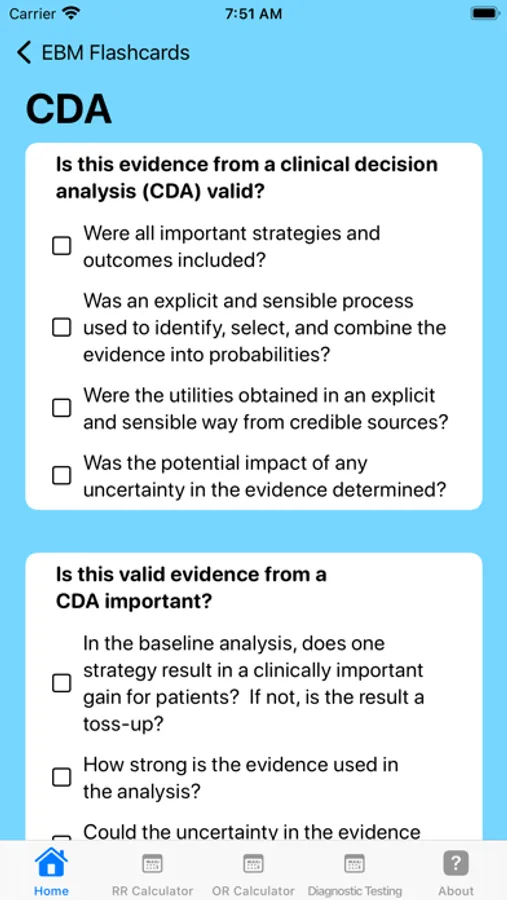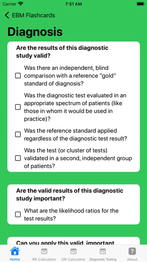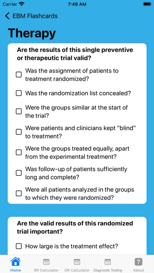 Evidence based medicine (EBM) article review questions for nine different article types (Therapy, Diagnosis, Harm, Prognosis, Overview, Qualitative research, Guidelines, Clinical Decision Analysis, and Economic Analysis). Includes calculators for Relative Risk, ARR, NNT, Odds Ratio, and Diagnostic Testing (sensitivity, specificity, PPV, NPV, LR+, LR-, prevalence and accuracy). Also calculates 95% CI for each of the parameters.