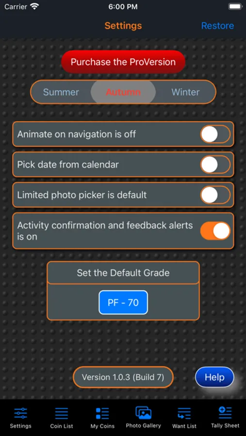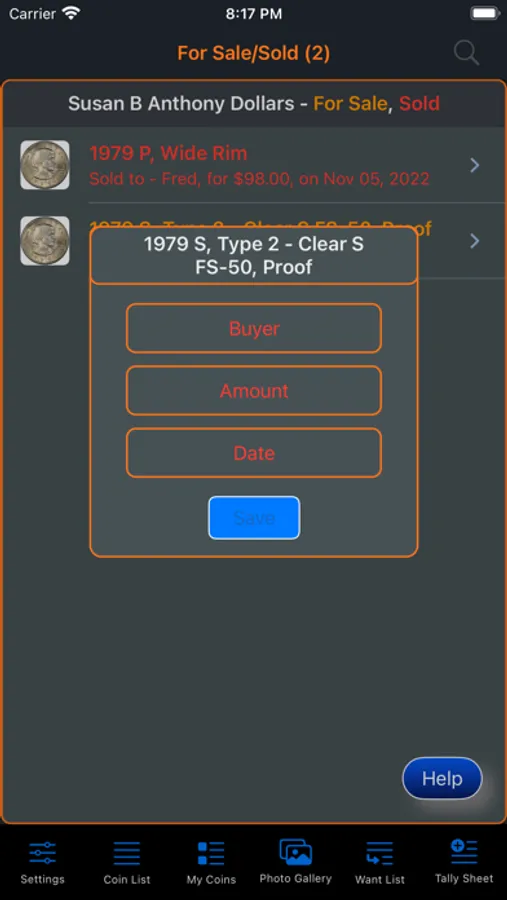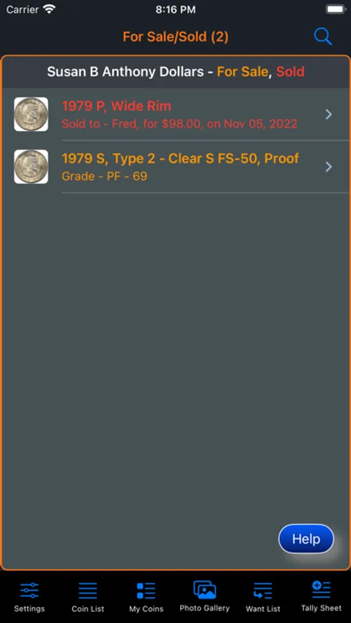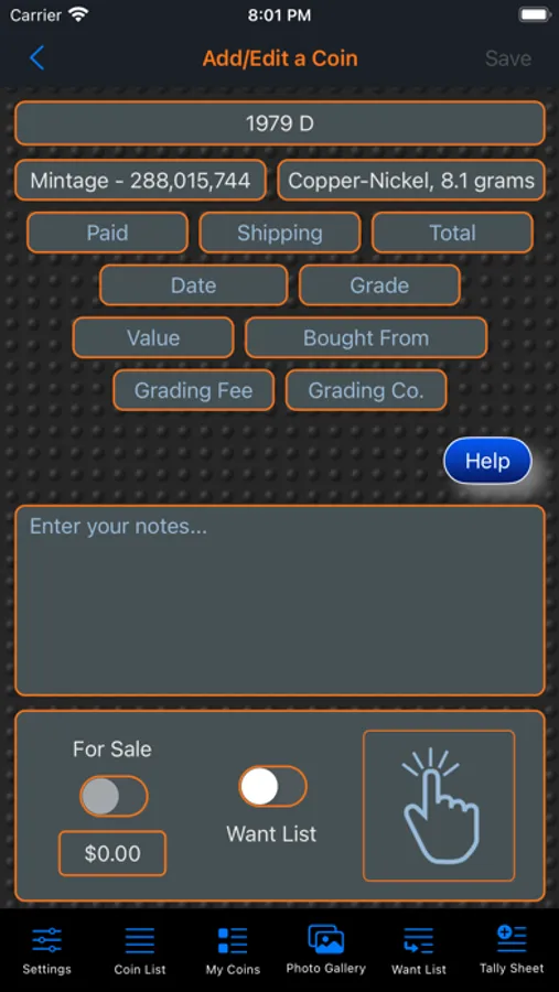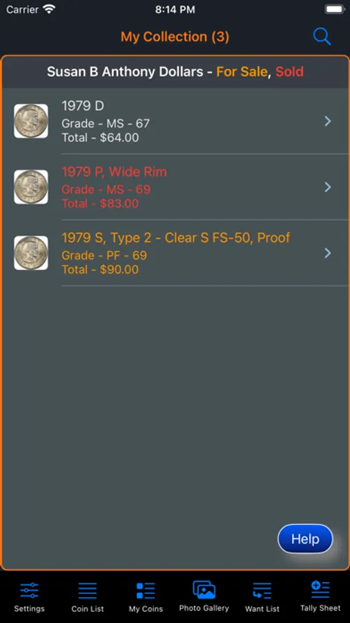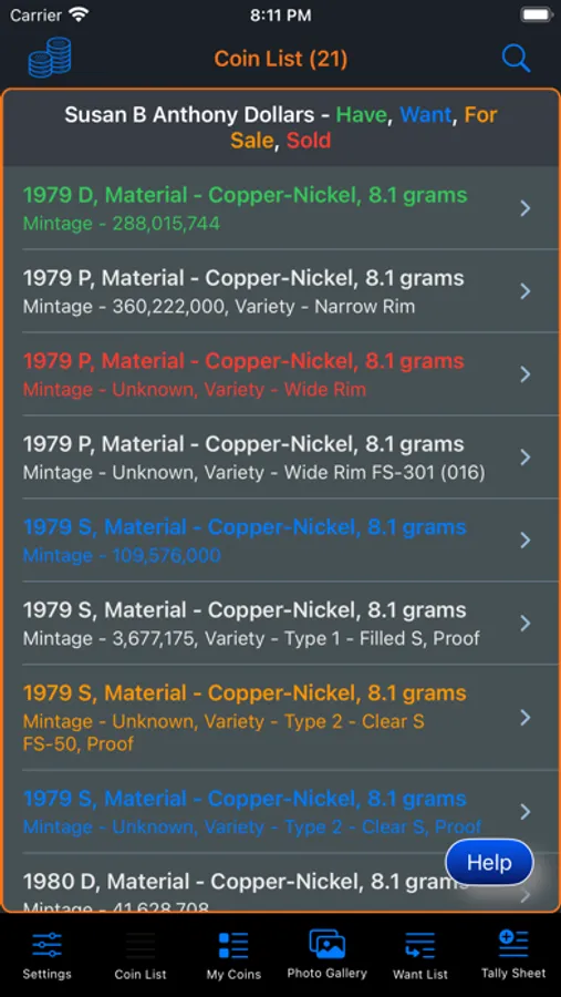 This app will provide the ability for the user to organize, track and manage their collection of coins. Images of each coin can be included with the collection. There is also a means within the app for the user to peruse all of the images in an entertaining manner. The app has three (3) color themes which help to make the app more enjoyable. A running tally of the cost for the entire collection is provided. A want list is also included in the app to allow you to ear-mark coins that you are searching for.