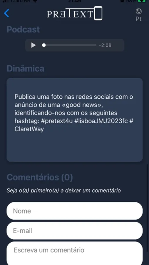 O PRETEXT4U é um projeto de humanização das redes sociais para jovens que, a partir do Evangelho e da Vida, ousem pensar “fora da caixa” e fazer bem ao próximo. No aplicativo os jovens encontrarão textos, vídeos, podcasts e dinâmicas além de outros materiais para refletirem e interagirem.