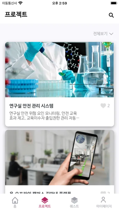 현재 진행되고 있는 스마트캠퍼스 프로젝트와 진행 예정인 프로젝트를 살펴볼 수 있습니다. 또한 프로젝트 관련하여 구성원의 자유로운 의견 제시도 가능합니다.
