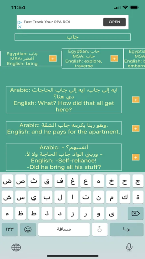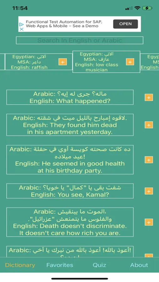 Learning Arabic is difficult enough with standard and colloquial, regional dialects, scary grammar... what's more, sometimes looking up a word isn't enough to figure out what you want to say! With Egypto Contexto, you can look up the word you need and see relevant examples taken from the scripts of modern Egyptian cinema and TV shows. You can also add words to your favorites list and then quiz yourself on them! This dictionary contains about 50,000 words, along with over 50,000 lines of dialogue from authentic Egyptian media. We also list the Modern Standard Arabic (MSA) equivalent of every Colloquial Egyptian word.