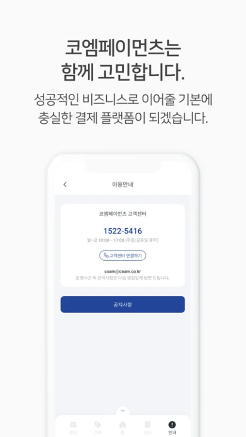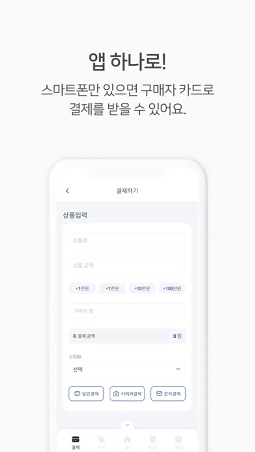 스마트폰 하나로 시간과 장소의 제약 없이 쉽고 안전하게 상품을 팔고 결제를 받을 수 있습니다.