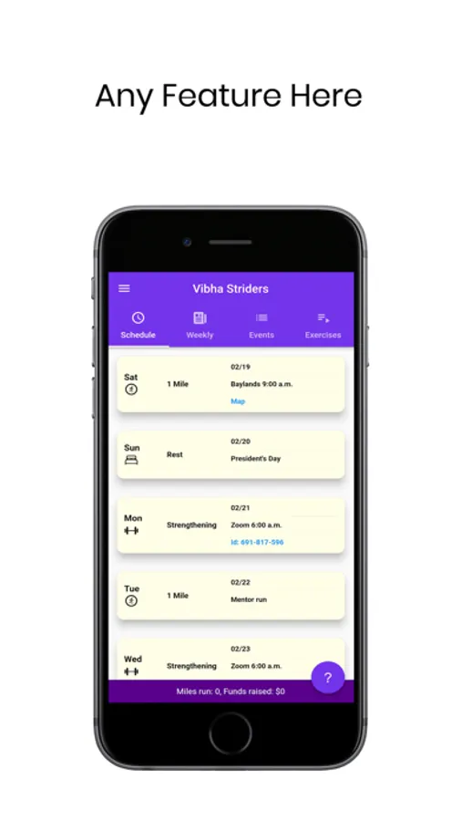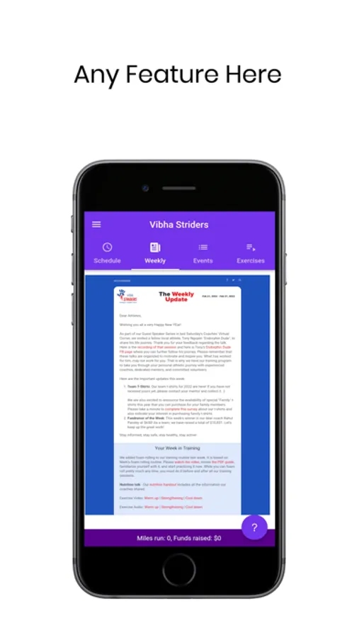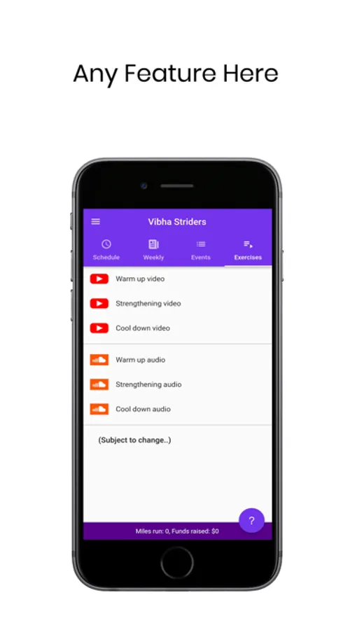 This app is used for the Vibha Striders Marathon training program. It shows the weekly training schedule, warm up / cool down / strengthening exercise videos, fundraising guide, etc.