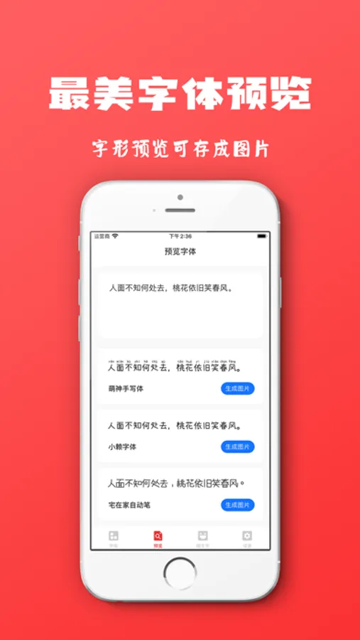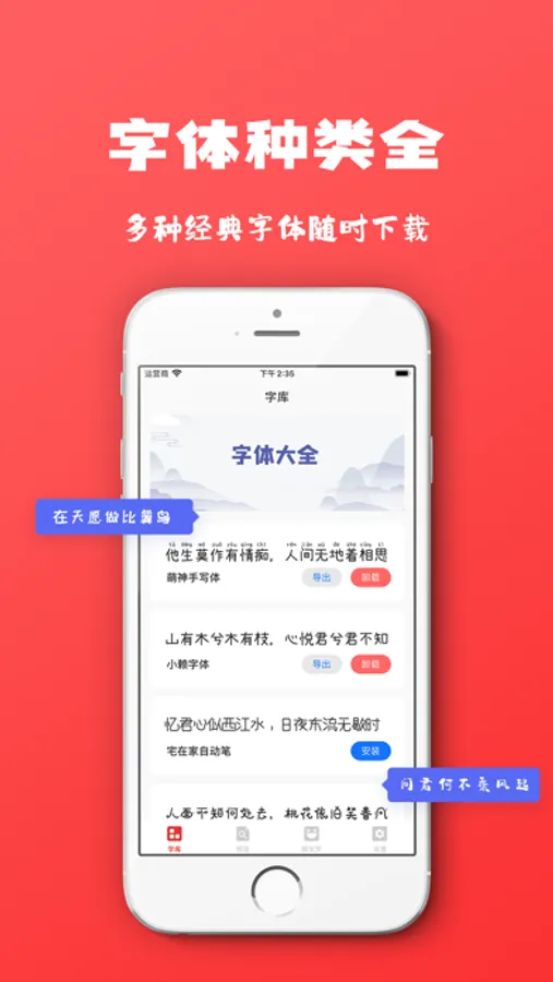 字体大全-一键安装至系统,我们准备了一些精选字体,您可以一键安装到系统。所有字体我们都设计了预览图片,也支持根据输入的内容自动生成预览图片。字体安装后,可以在系统的“设置” → “通用” → “字体”中查看,也支持导出安装的字体。我们还准备了一些颜文字,点击就可以复制。
