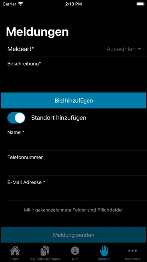 * Melder - Ihr direkter Draht zu uns (Senden Sie und z.B. Straßenschäden, Vandalismus oder allgemeine Rückmeldungen zum Gemeinde Leben)