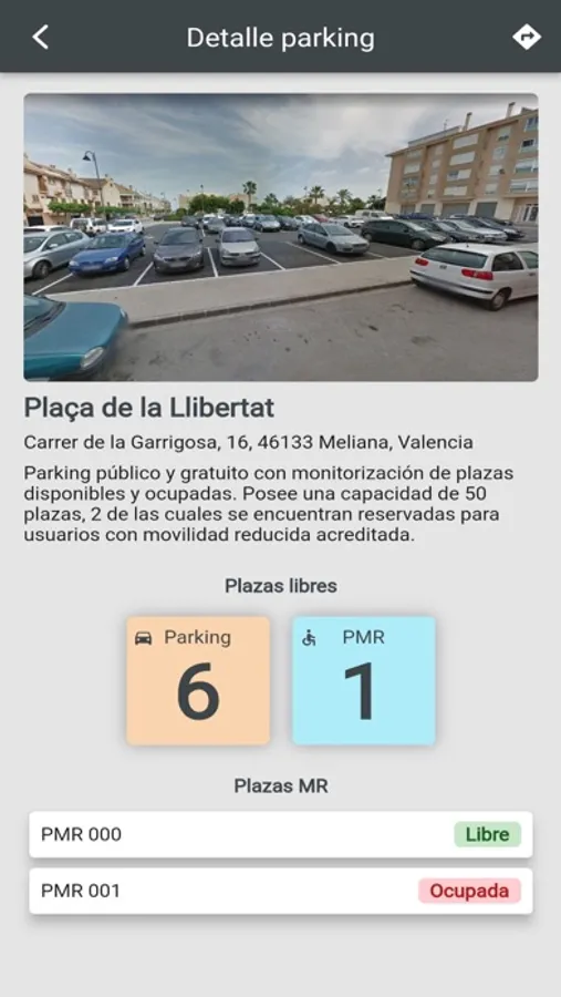 La aplicación Smart Parking Meliana permitirá a los conductores la identificación de zonas de aparcamiento alternativas. Se busca facilitar a los conductores la localización de plazas de estacionamiento libres, evitando la circulación de vehículos por el centro urbano buscando lugares para estacionar, y con ello reduciendo los problemas de tráfico que genera su lenta circulación o su estacionamiento indebido (aceras, doble fila …). Como consecuencia se generará una reducción de la emisión de los gases contaminantes procedentes de la combustión de los carburantes.