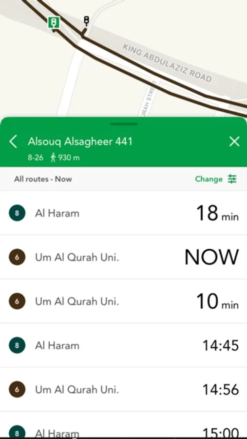 The App features an interactive map of Makkah, on which you can check real-time arrival predictions for all bus stops on all routes in the network.
