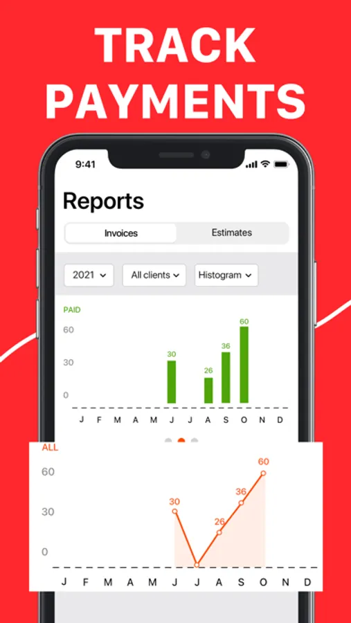 PDF reports can be generated for invoices, estimates and payment summaries. These can be organized by month, customer or item for convenient accounting and bookkeeping.
