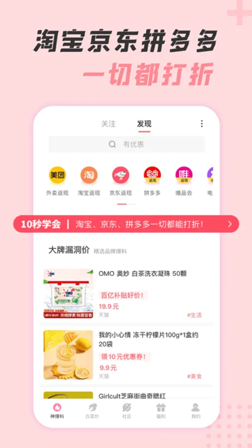 神奇口袋App,简单好用的省钱神器!淘宝、京东、拼多多、唯品会等各大平台上超过90%的商品都能帮您省钱买到!外卖还能领红包拿返现。