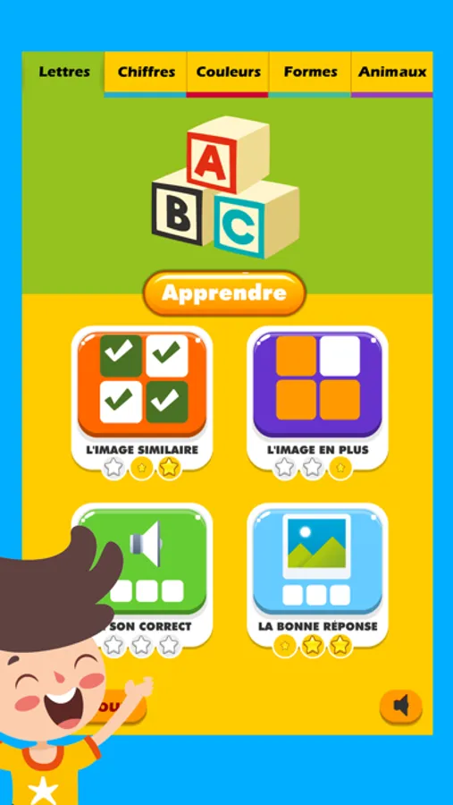Learn french alphabet for kids also contains the challenge which is a form of quiz where the child can find several sections in the same exercise with ten levels