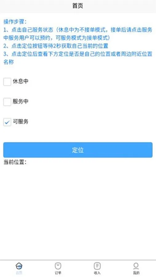 技约师傅端,师傅可以在技约师傅端里面管理自己订单,设置自己服务状态,修改个人资料等,便捷的订单管理助手。 定位:登录账号后点击定位等待提示定位成功即可, 订单:可在订单中查看服务对象的个人信息,可一键导航。 收入:可查看每笔订单的收入。 我的:可查看自己个人信息,修改信息,上传照片等