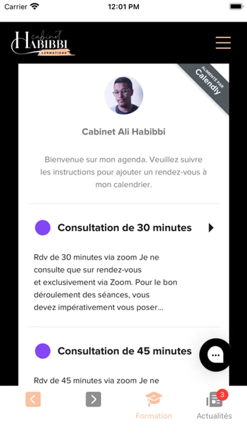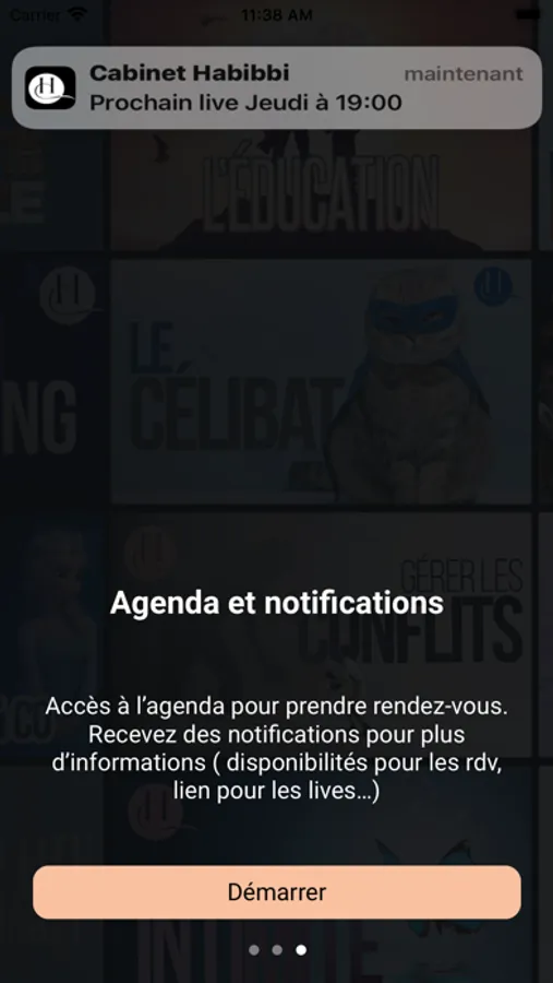 Accès à l’agenda pour prendre rendez-vous. Recevez des notifications pour plus d’informations ( disponibilités pour les rdv, lien pour les lives privés…)