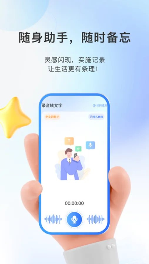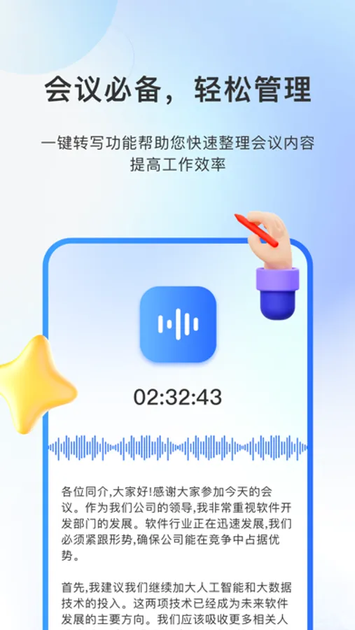 欢迎使用我们的实时录音转文字App!无论是会议、课堂还是采访,我们的App都将成为您的得力助手。通过一键转写功能,您可以轻松将录音转换为文字,省去了繁琐的手动输入和记笔记的过程。