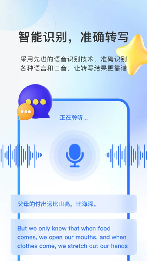 3.智能识别:我们的App采用了先进的语音识别技术,能够准确识别各种语言和口音,确保转写结果的准确性和可靠性。