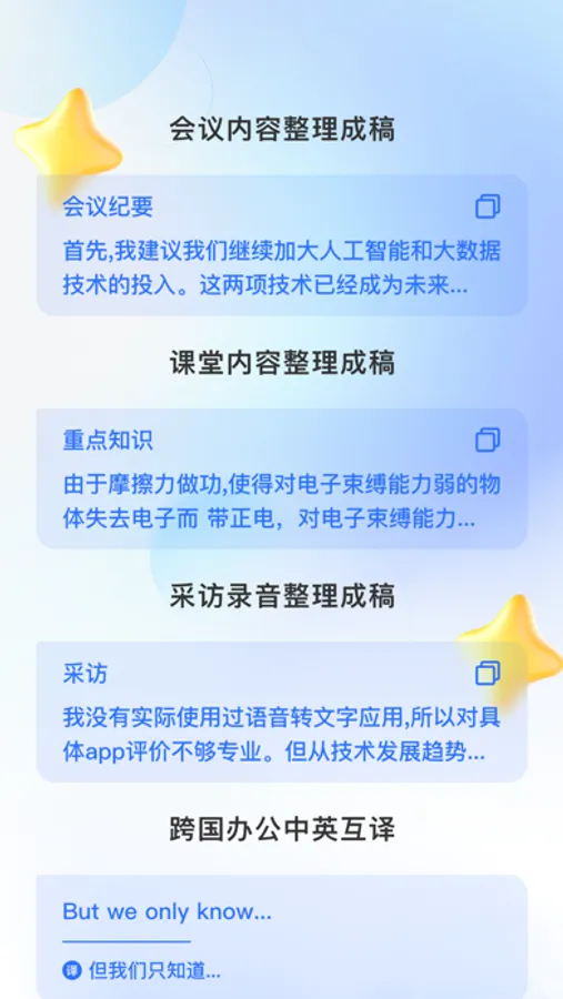 4.学习辅助:学习外语时,您可以使用我们的App将听力材料转写成文字,帮助您更好地理解和学习。