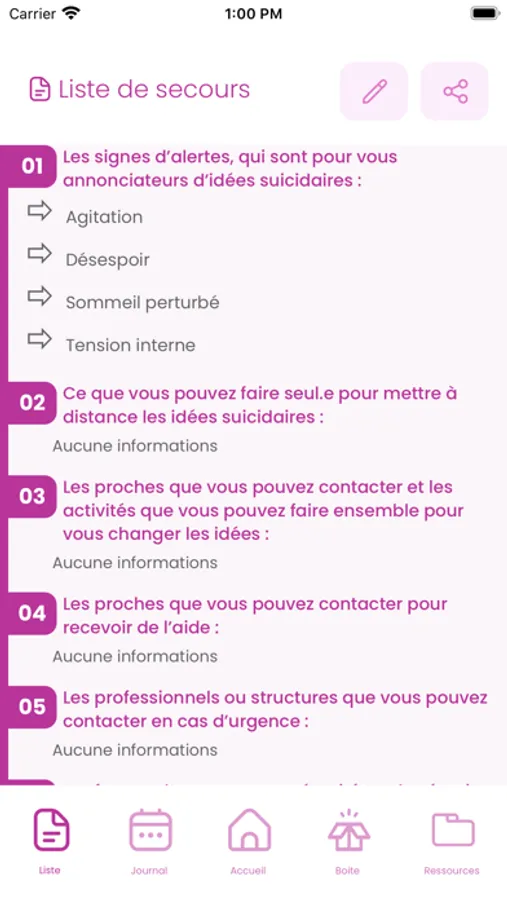 On discharge from hospital, emergencies or in consultation, a caregiver trained in the use of Hop ma liste accompanies the user in the creation of his emergency list to help him act against suicidal thoughts. It is a complementary resource to medical care.