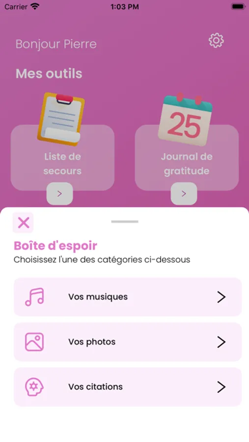 - A box of hope allowing to gather in the same place the photos, music and quotes appreciated by the user;