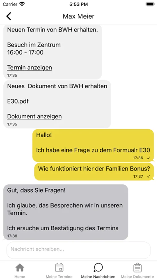 - Übermittlung von Dokumenten (Bilder, Schriftverkehr, Dokumente, Nachweise) zwischen den Beteiligten