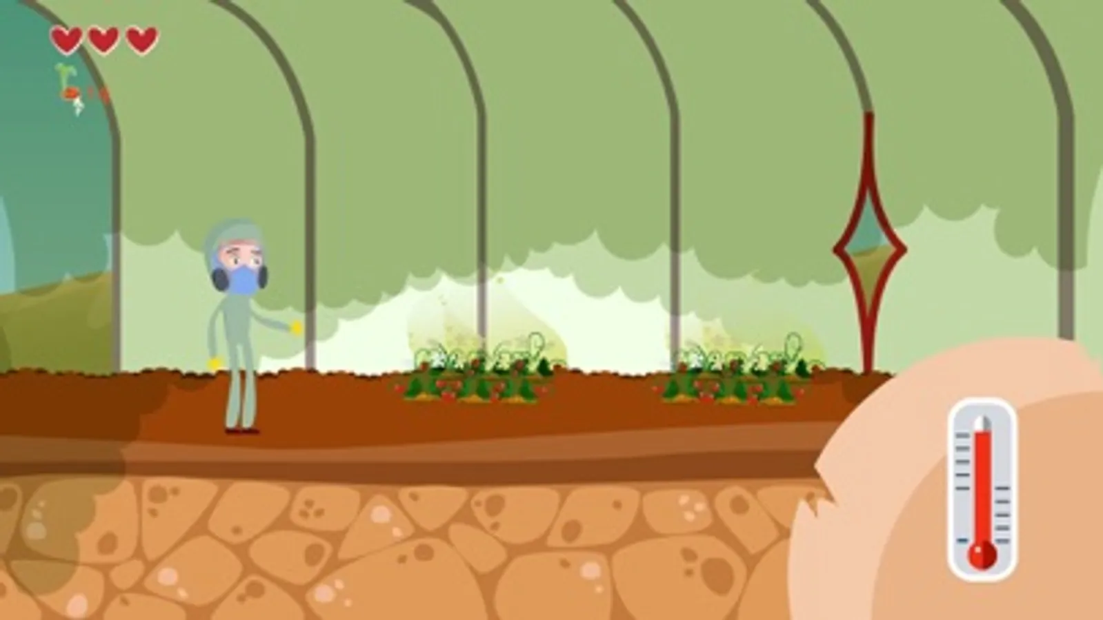 Throughout the levels, the game character will face a wide range of sector-related risks, including weather (sun, cold, rain), pollution, animal bites/stings, chemicals (greenhouses, pesticides), loads, sharp tools and to introduce some protectives measures. In order to win the levels, the player must choose the correct prevention and protective measures to avoid physical, chemical and psychological hazards in agriculture.