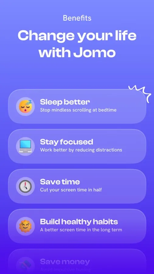 Welcome to Jomo, an app that helps you stop wasting time on your phone so you can thrive every day!