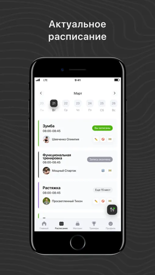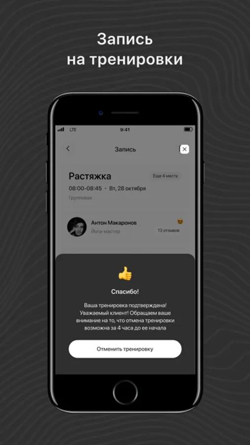 - Получать PUSH-уведомления о предстоящей тренировке за 3 часа;