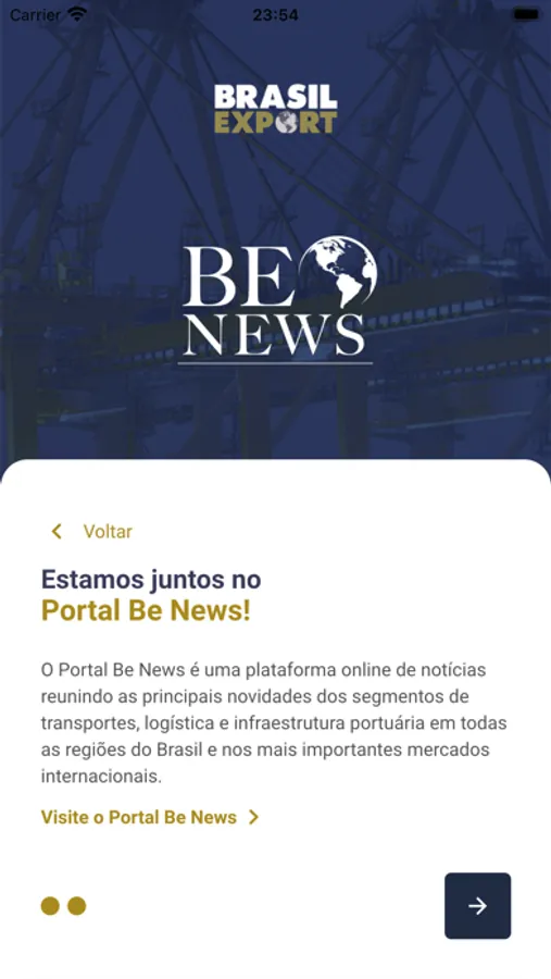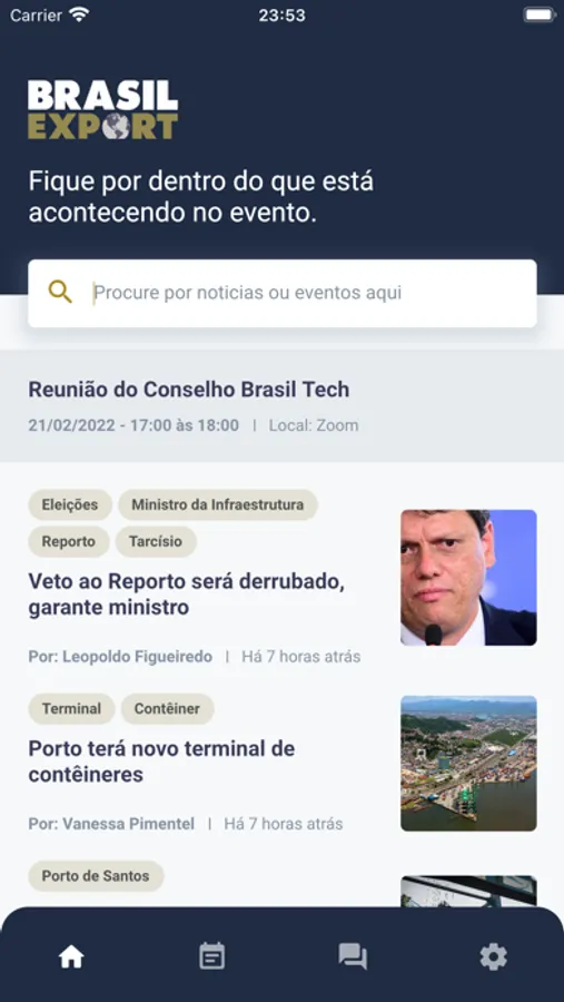 O aplicativo do Brasil Export facilita a gestão de atividades e a comunicação entre conselheiros, patrocinadores, autoridades e o público em geral interessado no universo da logística e da infraestrutura portuária. Nele você recebe notificações e encontra notícias publicadas pela multiplataforma de notícias BE News, além de do calendário de reuniões, lives e eventos organizadas pelo Fórum. O uso do aplicativo é gratuito.
