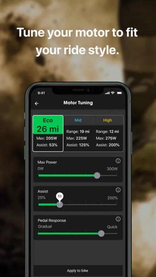 Use Trek Central to adjust how the assist from your motor feels. Adjust Max Power, Assist Factor, and Pedal Response to optimize YOUR ride. Turn it down to maximize range, get better traction, or make the bike easier to handle on tricky climbs. Crank it up if you want to go turbo-all-the-time. Note - Tuning options vary by model.