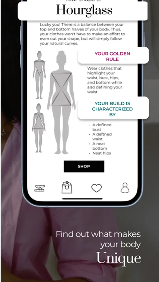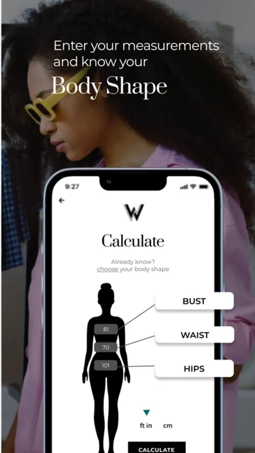 First measure your bust/chest, waist and hips. Log that information and get your body shape. If you have problems with measurement process, we have created a special feature for you. Just take your photo following all the requirements suggested by the app, and we will calculate your body shape according to the data. In addition, you can read about your body shape and suitable clothes right in our app.
