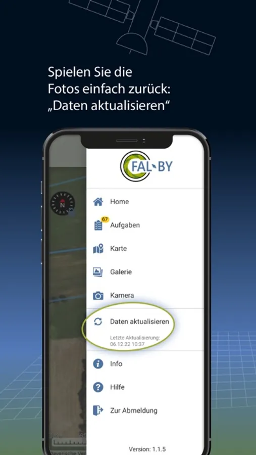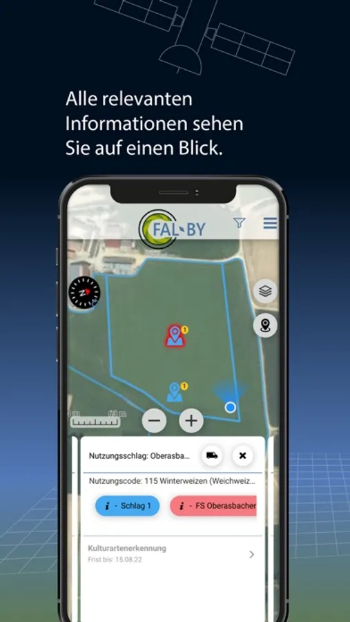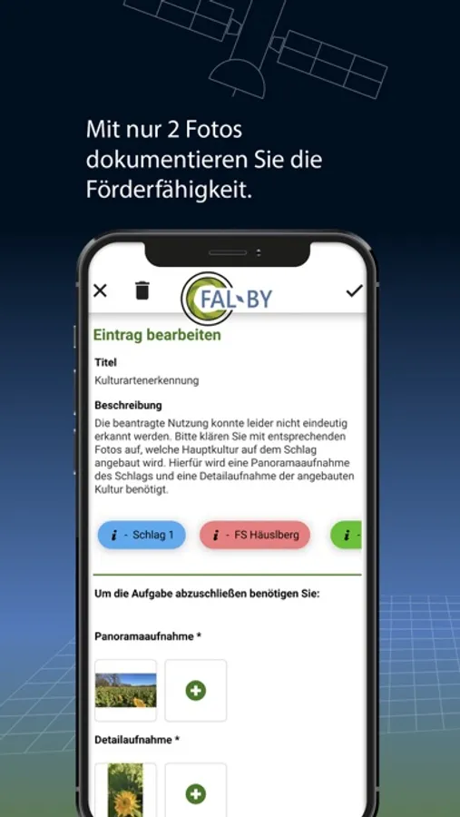 Wenn durch das Satelliten-Monitoring kein eindeutiges Ergebnis erzielt werden konnte, bekommen Sie als angemeldeter Nutzer eine Aufgabe in FAL-BY. Die Kartenansicht erleichtert dabei die Orientierung. Sie können dann an der konkreten Fläche ein oder auch mehrere Fotos aufnehmen. Diese Fotos helfen Ihrem zuständigen Sachbearbeiter am AELF die Situation zu bewerten. In den meisten Fällen können Unstimmigkeiten anhand der eingereichten Fotos schnell geklärt werden. Eine Vor-Ort-Kontrolle ist dann in vielen Fällen nicht mehr notwendig und spart Zeit.