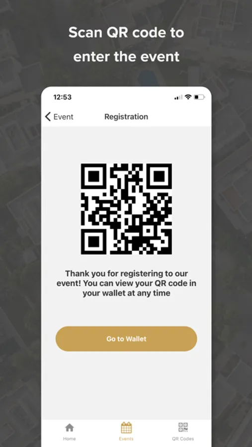 - Generating a QR code. Once the registration is complete, the app generates a QR code which can be found in the QR code wallet. This code is used by the visitors on-site during the day of the event in order to register their attendance.