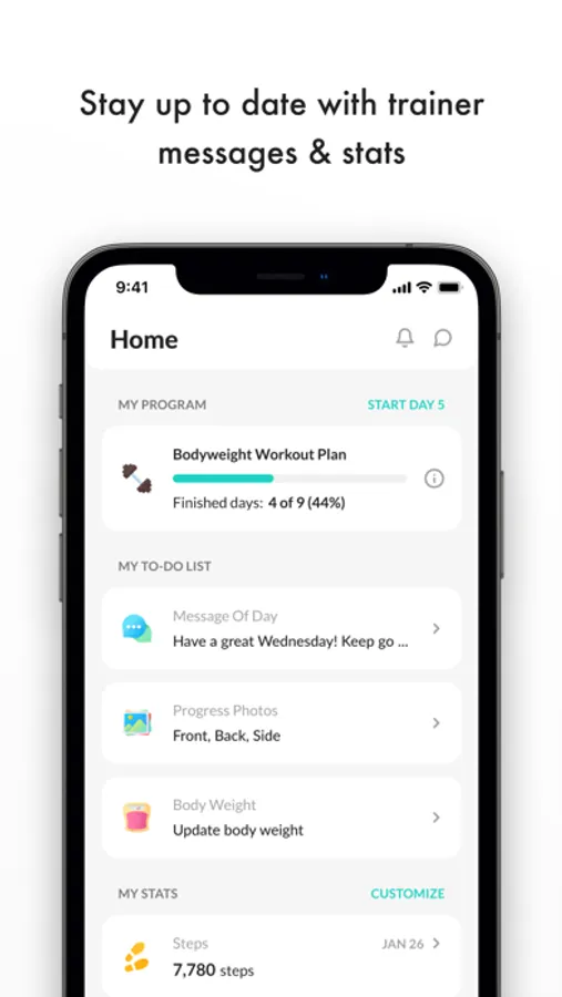 From the app, you can view our messages, view your daily fitness statistics, follow the prescribed fitness plan, and see your daily nutrition overview. We also work with the Apple Health App to keep track of your steps and calories burned.