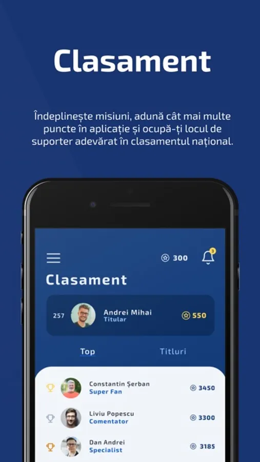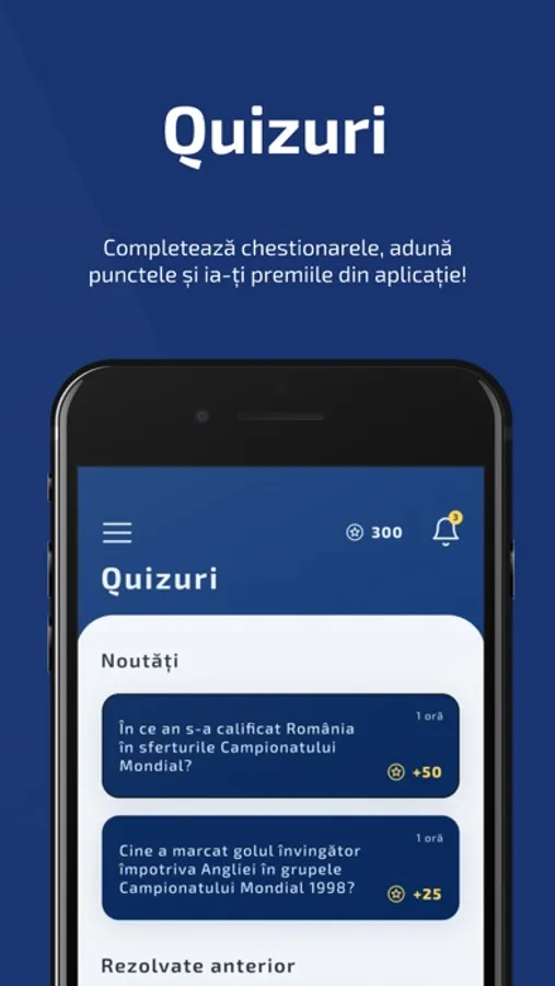 - Testează-ți cunoștințele de suporter! Completează quizurile din aplicație și câștigă puncte cu ajutorul cărora revendici premii din magazin;