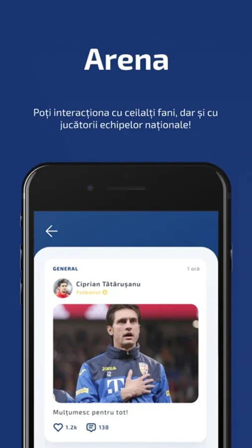 Aplicația Fan Arena by FRF îți completează kitul de suporter tricolor! Fii primul care află ultimele vești din cantomentul echipei naționale, când se pun în vânzare biletele la meciuri și împărtășește trăirile cu alți fani ai naționalei, pe platorma dedicată fanilor României. Ai experiențele pe care le iubești ca suporter, la un click distanță!