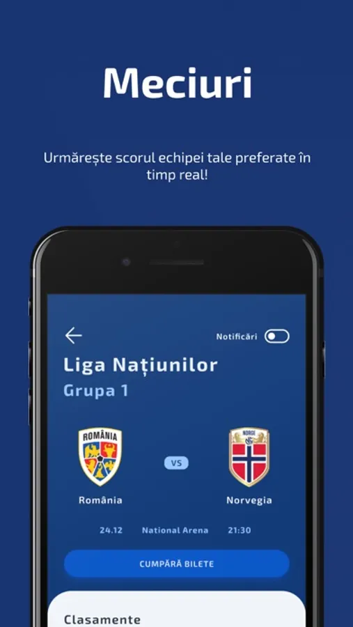 - Cumpără bilete la meciuri de pe telefon, fii alături de națională și bucură-te de atmosfera magică de pe stadion;