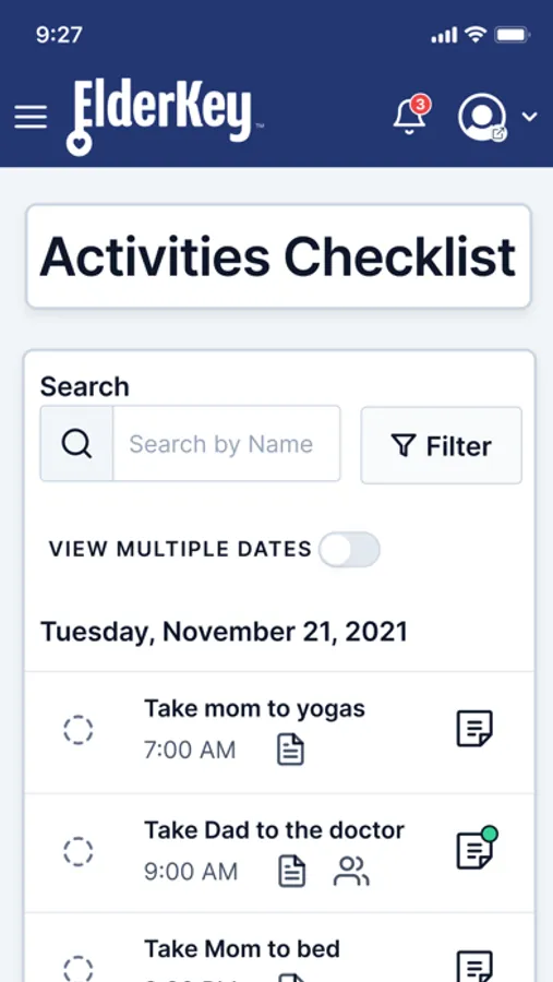 From the Notifications feature, users receive and acknowledge notifications sent for ElderKey.com care plan updates (Activity, Instruction, and Medication changes), Activities not performed on time, and “Direct Alerts” notification sent by other Champions or Caregivers.