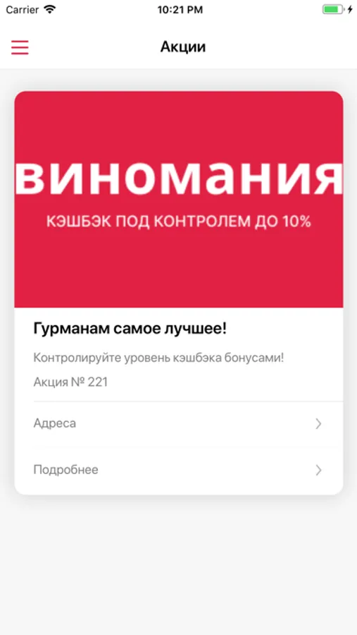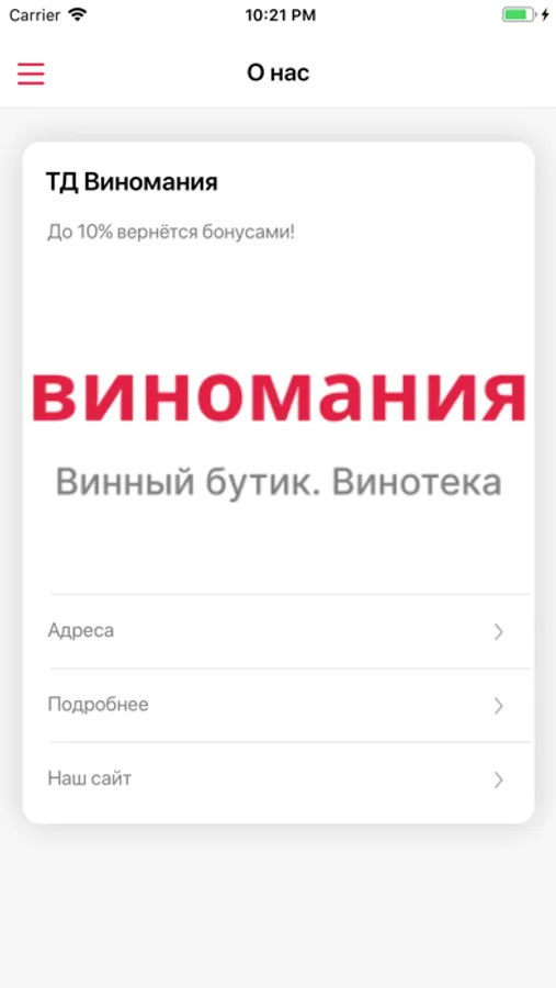 Реализовано брендом “Торговый Дом Виномания”, специально для своих почитателей и клиентов, современного сервиса обслуживания, и конечно же любителей бонусов и скидок в нужное время, в нужном месте!