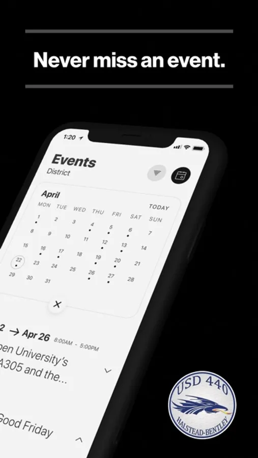 The event section shows a list of events throughout the district. Users can add an event to their calendar to share the event with friends and family with one tap.
