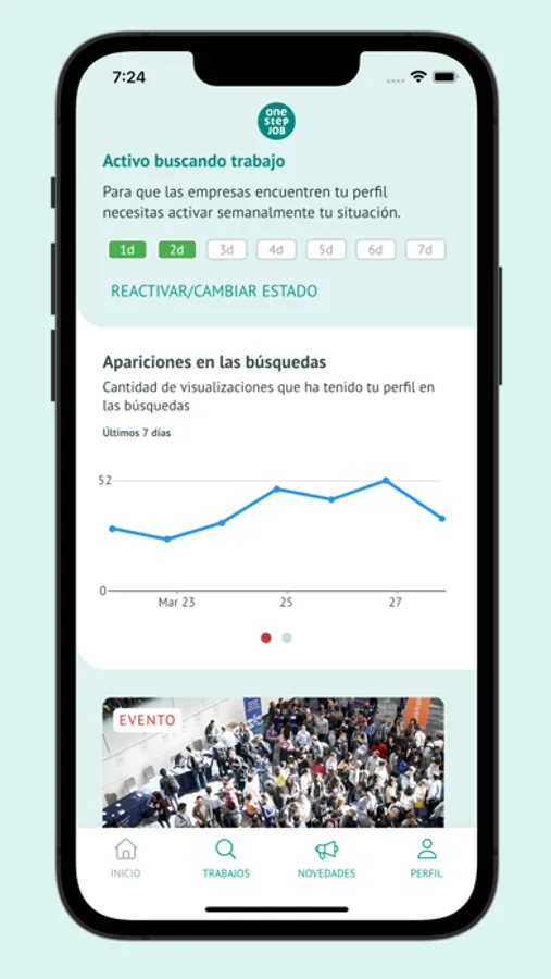 Cuanto más completo sea tu perfil, más facilidad para que las empresas te encuentren. Además podrás ver la estadística de las búsquedas en las que has aparecido en la última semana.