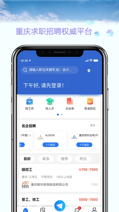 重庆招聘网是重庆本地求职招聘平台,通过APP、小程序等服务重庆本地企业和求职者。通过在线直聊、视频招聘会、视频面试等,快速的帮助求职者找到工作、帮企业招到人才。