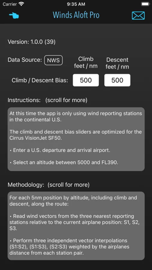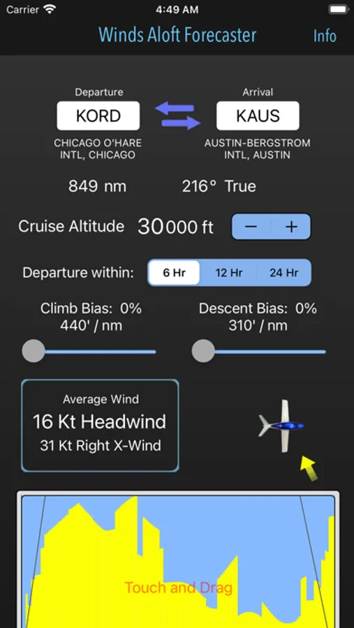 Calculates winds aloft for U.S. locations from 5000 feet to 39000 feet. Crosswinds can also be displayed for winds along your route of travel. Climb and descent biases can be manually modified for different aircraft performance numbers.