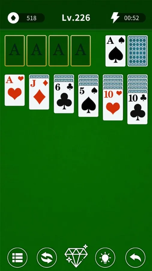 At the beginning of the game there are 10 rows of cards. There are 6 cards in 4 rows on the left and 5 cards in 6 rows on the right. Only one card in the row is fully exposed and face up. The rest of the cards are placed in the corners of the screen at the bottom. are piled up.