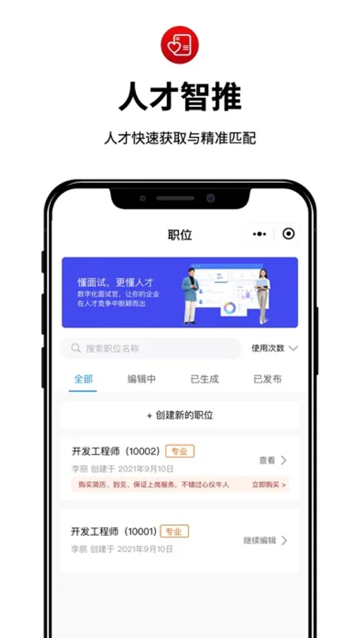 四大核心技术:智能专业面试问卷、视频面试、人才智推、AI分析,实现人才快速获取与精准匹配。
