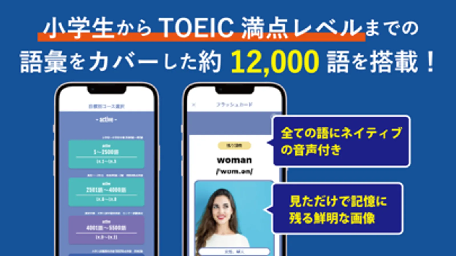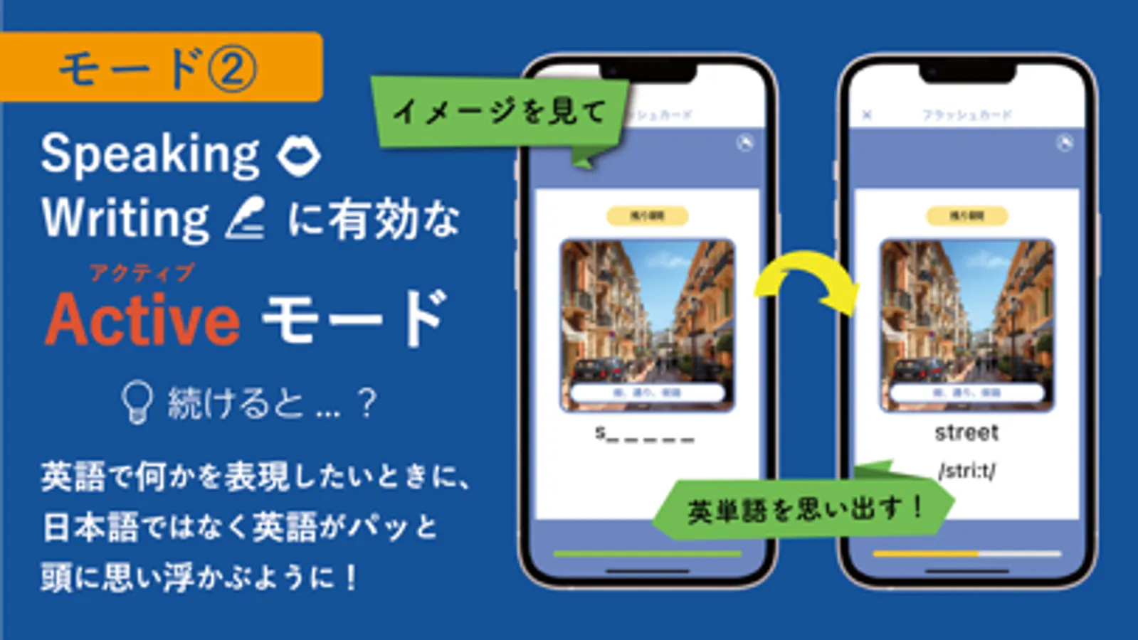 本アプリには、画像を見て英単語をアウトプ ットするactiveコースがあります。このコースでの学習を通して、日本語を介さず、概念をそのまま英語にできるactive vocabularyが身につくのです。それによりスピーキングやライティングといったインプット作業が非常に得意になれるということです。