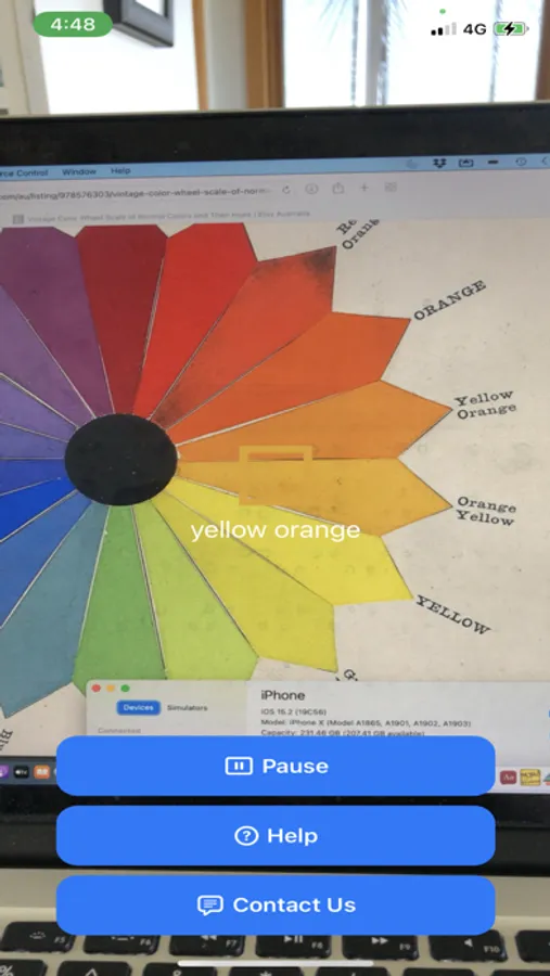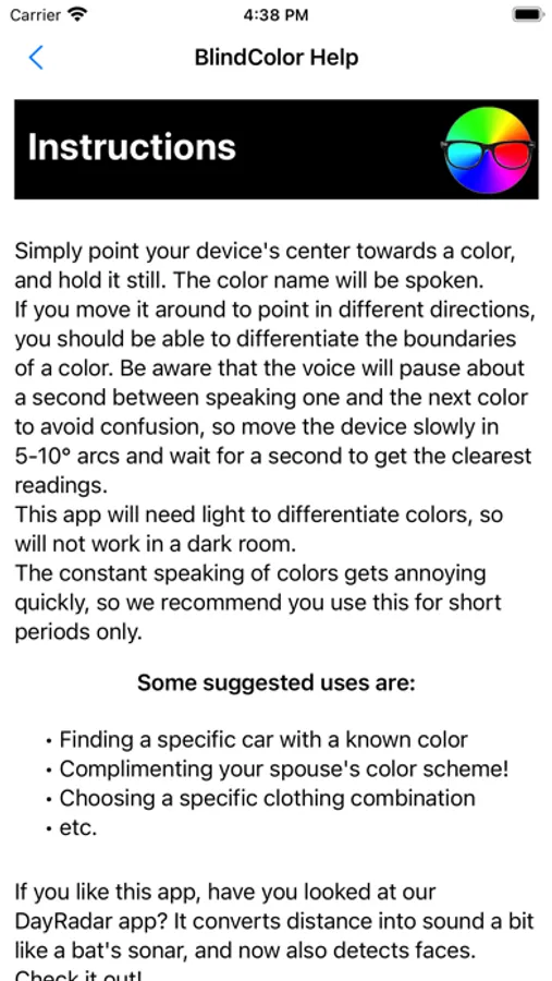 Converts the central pixel of your iPhone or iPad screen into a spoken string identifying that color. It aims to assist low vision or blind people to identify colors. It can be used for identifying the color of cars, clothes, combinations of clothes, and other colors in your world. It can also be used by those with color blindness to identify colors that otherwise might confuse them. It's a simple app but hopefully will help someone with color vision issues.