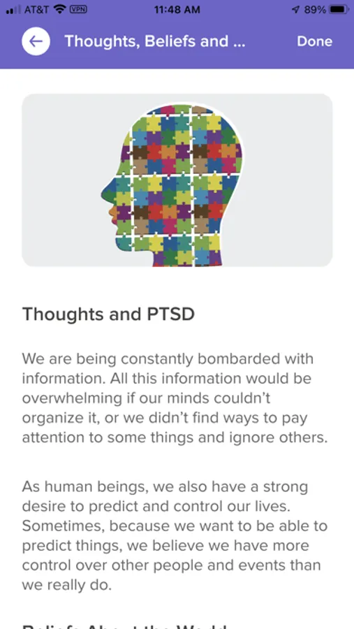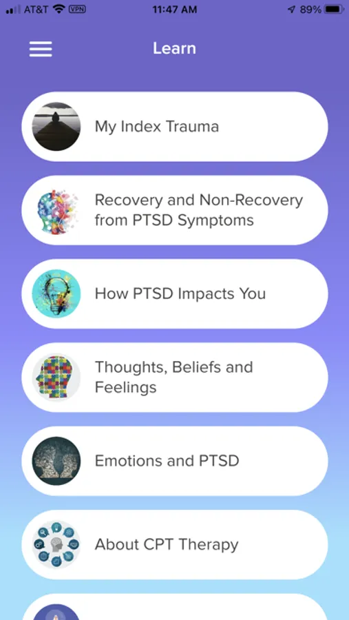 CPT Coach is for people who are participating in Cognitive Processing Therapy (CPT) with a professional mental healthcare provider. This app contains support materials for a complete course of CPT to help patients manage their treatment, including between session assignments, mobile versions of CPT worksheets, readings, and PTSD symptom monitoring.