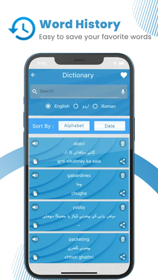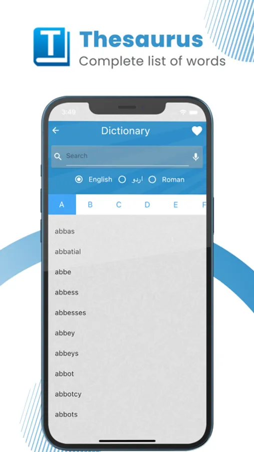- Thesaurus – sorted list of all words starting with alphabets in English, Roman, and Urdu.