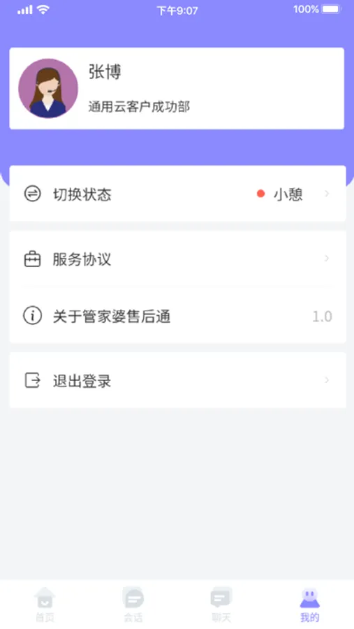 我的:切换当前客服在线状态、服务协议、版本号、退出登录;