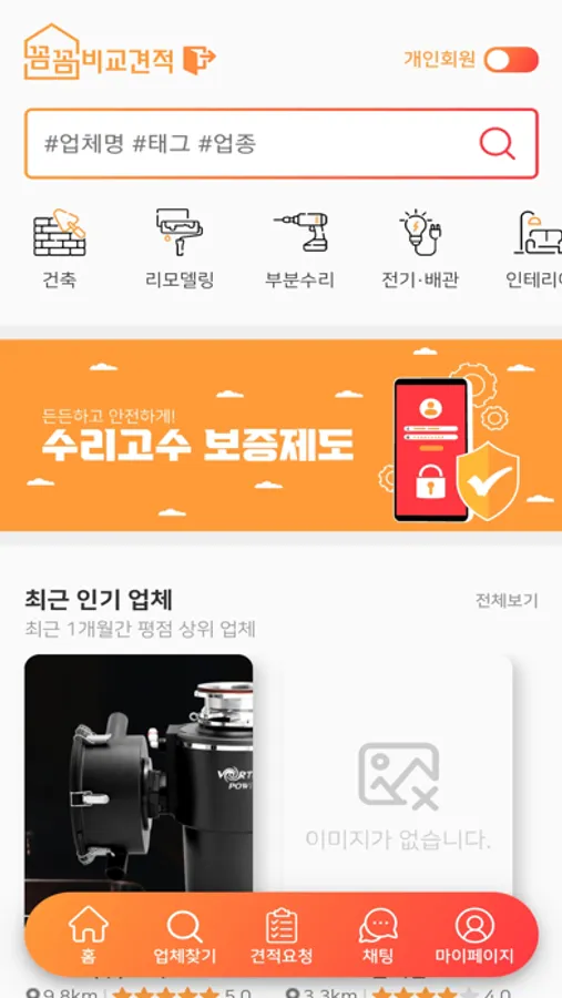 “꼼꼼”비교견적은 위치기반서비스를 바탕으로 홈인테리어(수리)관련 업체와 업체를 필요로 하는 고객을 매칭시켜주는 홈인테리어 중개 플랫폼으로 고객은 도움이 필요한 서비스에 대해 요청하고 근처에 있는 검증된 업체에서 고객이 원하는 요청에 맞춰 견적을 보내게 됩니다.