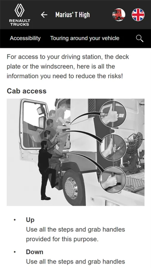 The application provides access to the driving support specific to your Renault Trucks vehicle. Available for vehicles produced since July and September 2021, depending on range.
