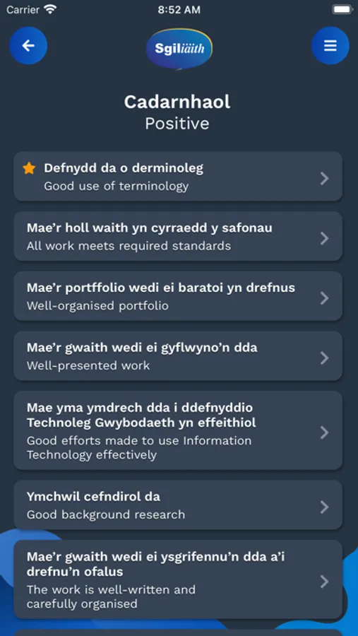 This app is aimed at practitioners in the post-16 education sector in Wales to support them in developing their Welsh language skills, in particular Welsh and bilingual learner feedback. The app provides both written and verbal versions of feedback suitable to be used by tutors and assessors. There is a range of feedback categories to choose from to suit all types of assessment: